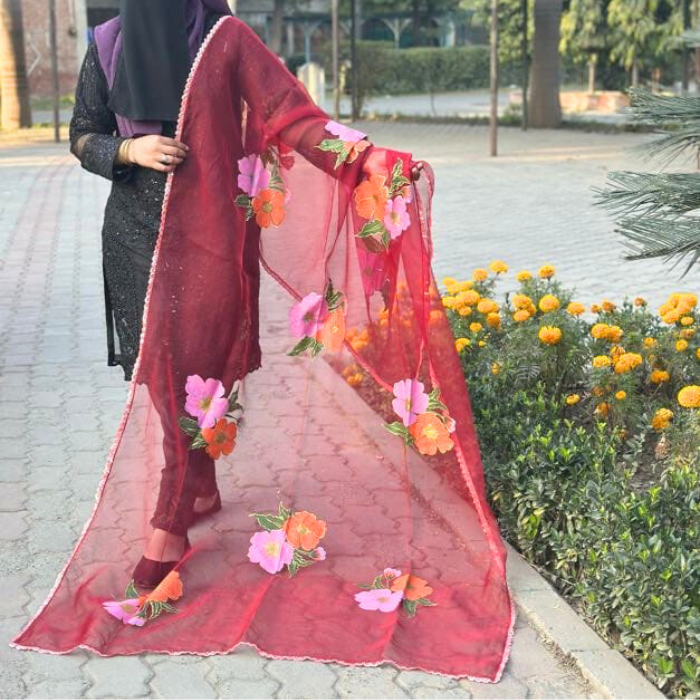 Hand Paint Organza Dupatta – Mehroon Shade